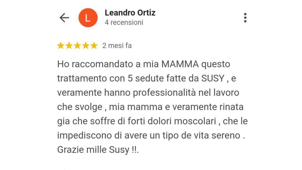 Pubblicato su Doriano RiccobonoTrustindex verifica che la fonte originale della recensione sia Google. Ho avuto modo di conoscere Alfredo il quale mi ha suggerito un trattamento di massaggi per problemi alla cervicale. Dopo anni che soffrivo di atroci contratture, adesso sto decisamente meglio. Persona professionale, simpatica e attento alle esigenza delle persone. Consigliato.Pubblicato su Donatella CimboliTrustindex verifica che la fonte originale della recensione sia Google. La mia esperienza è iniziata e sta continuando con Alfredo, persona molto disponibile all'ascolto e senza dubbi di un empatia e simpatia non comuni. Dal punto di vista professionale trovo che la sua preparazione sia ottima e per quanto riguarda i miei dolori, ha sempre trovato il modo di alleviarli. Non si tratta solo di massaggi, ma anche di competenze che porta in ogni sessione, per raggiungere i risultati necessari.Credo di aver trovato definitivamente il massaggiatore che fa per me.Pubblicato su Florence NavetTrustindex verifica che la fonte originale della recensione sia Google. Grazie con tutto il cuore a Susi per la sua professionalità e gentilezza. Susi ha saputo prendersi cura e lenire il mio dolore dopo la maratona di Firenze. È stata estremamente efficiente ed è riuscita a calmare la mia sofferenza. Susi è un vero mago e ha le mani d'oro. Ancora una volta un enorme grazie per il vostro servizio.🙏💚💚Pubblicato su Sylvie SpinelliTrustindex verifica che la fonte originale della recensione sia Google. Abbiamo conosciuto Susi e Alfredo durante la Firenze Marathon!!! Sono fantastici! Alfredo è stato così gentile di massaggiarmi subito dopo la mia corsa , mi ha rimesso in moto subito. Grazie per la vostra simpatia ai tutti e due!! Quando torno in Toscana vengo a trovarvi! SYLVIE da Marrakech 🫶Pubblicato su Michela FiordelisiTrustindex verifica che la fonte originale della recensione sia Google. Ho fatto diversi massaggi con il sig Chiodo persona competente e professionale Soffro da anni di mal di schiena Sono stata in cura da diversi fisioterapisti ma solo ora con questo tipo di massaggi finalmente mi sento bene . Lo consiglio vivamentePubblicato su Anca-Iuliana NicolaeTrustindex verifica che la fonte originale della recensione sia Google. Had the luck to be handled by Alfredo after Firenze’s marathon in 2024, and without his magic massage, I would have been unable to walk that day; he took care of many athletes with good care, and positive attitude that made the experience enjoyable. Thank you 🙏🏼Pubblicato su Teresa FerraraTrustindex verifica che la fonte originale della recensione sia Google. Ho effettuato 5 massaggi con Alfredo il quale, dopo un’anamnesi completa, è stato molto attento ad ascoltare le mie problematiche e competente nell’ eseguire i trattamenti più adatti per il mio caso specifico. I miei dolori fisici sono diminuiti e mi ha dato dei consigli molto utili. Oltre alla sua professionalità, ho apprezzato molto la sua gentilezza nei modi e affabilità. Lo consiglio a tutti!Pubblicato su Leandro OrtizTrustindex verifica che la fonte originale della recensione sia Google. Ho raccomandato a mia MAMMA questo trattamento con 5 sedute fatte da SUSY , e veramente hanno professionalità nel lavoro che svolge , mia mamma e veramente rinata gia che soffre di forti dolori moscolari , che le impediscono di avere un tipo de vita sereno . Grazie mille Susy !!.Pubblicato su cristina sartiTrustindex verifica che la fonte originale della recensione sia Google. Ho fatto dei trattamenti con Susy e mi sono trovata molto bene sia da un punto di vista professionale che umano. Un’esperienza molto positiva che mi riprometto di ripetere presto.Pubblicato su Cristian TontiTrustindex verifica che la fonte originale della recensione sia Google. Fantastico, mi ha rimesso al mondoCarica di più
